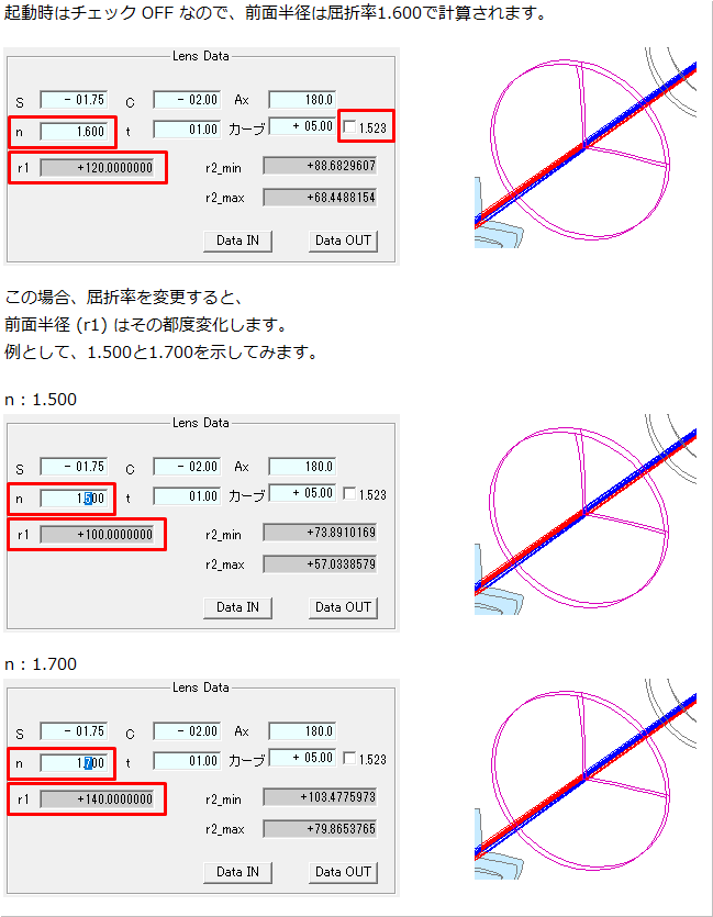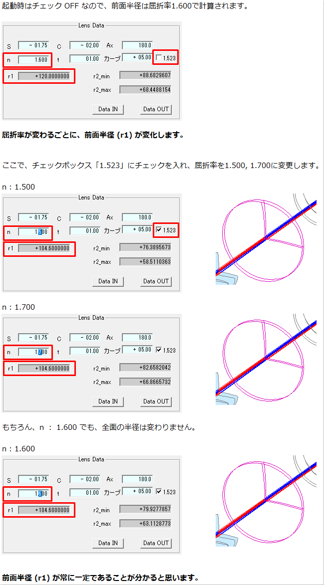 チェック ON で、被検レンズの屈折率に関わらず、前面半径 (r1) を屈折率1.523で計算します。